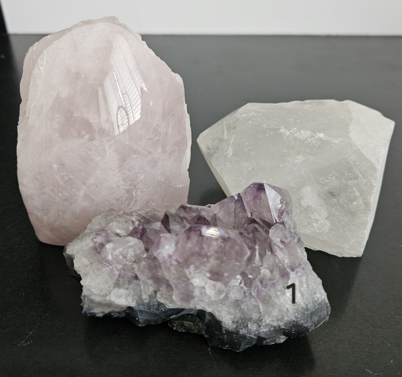 Prachtige combinatie van amethist, bergkristal en rozekwarts.