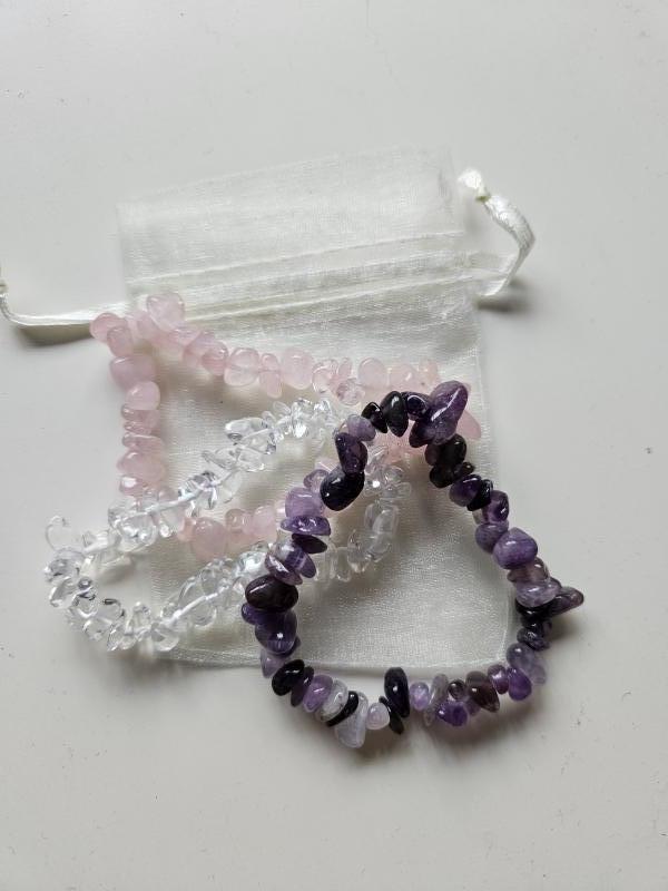 Leuke en vooral mooie kwaliteit splitarmbanden zijn deze amethist, bergkristal en rozekwarts en een organza zakje. Terug naar overzicht